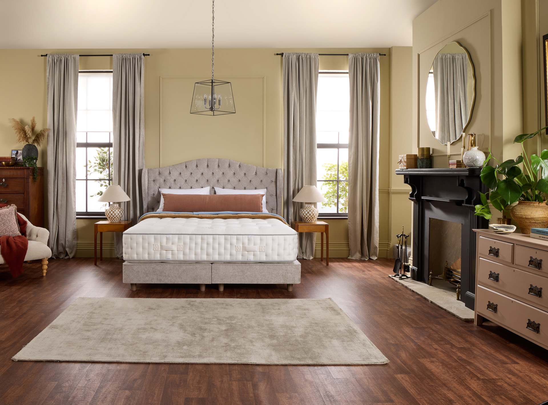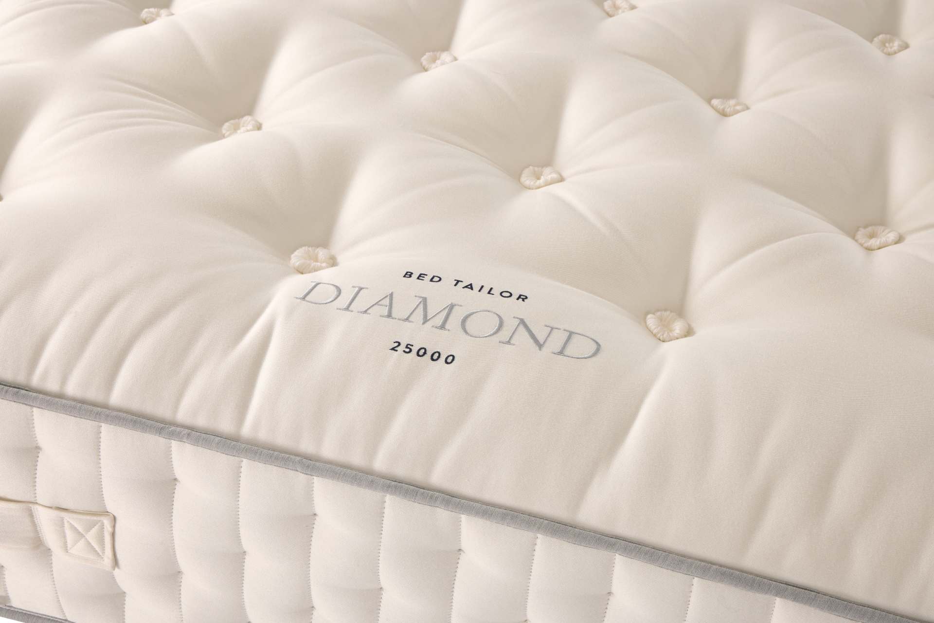 The Diamond has a 25000 CortecTM Quad spring system, contouring HD 4000, HD 2500 and HD 2000 Micro Springs. With an in-house woven FR chemical treatment free mattress cover and four rows of diamond side stitching, this Seasonal Turn mattress has a warming wool winter side and cooling cotton summer side.