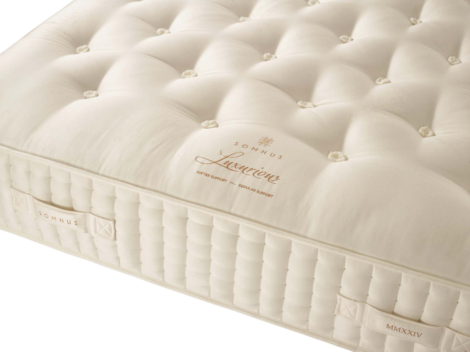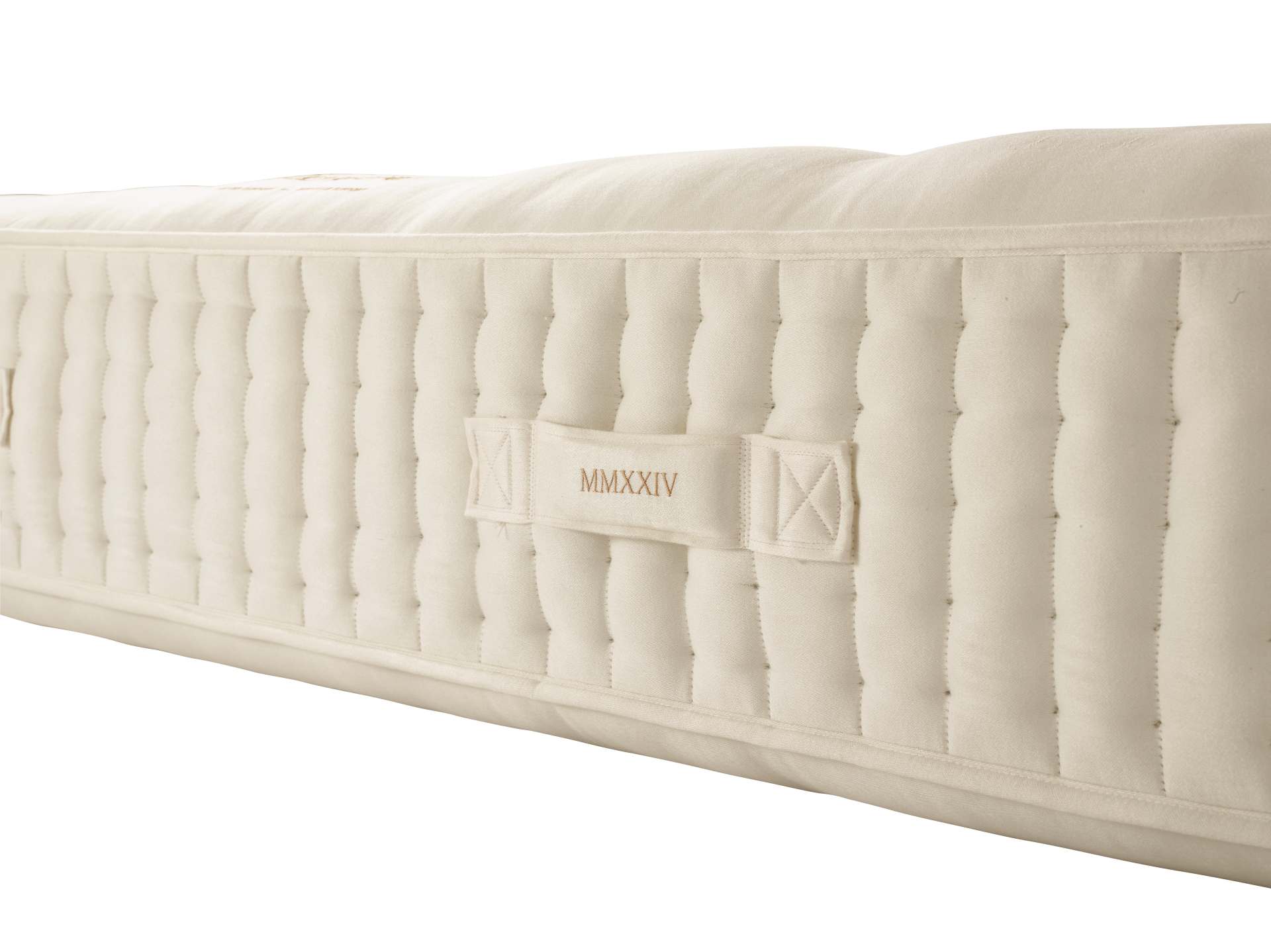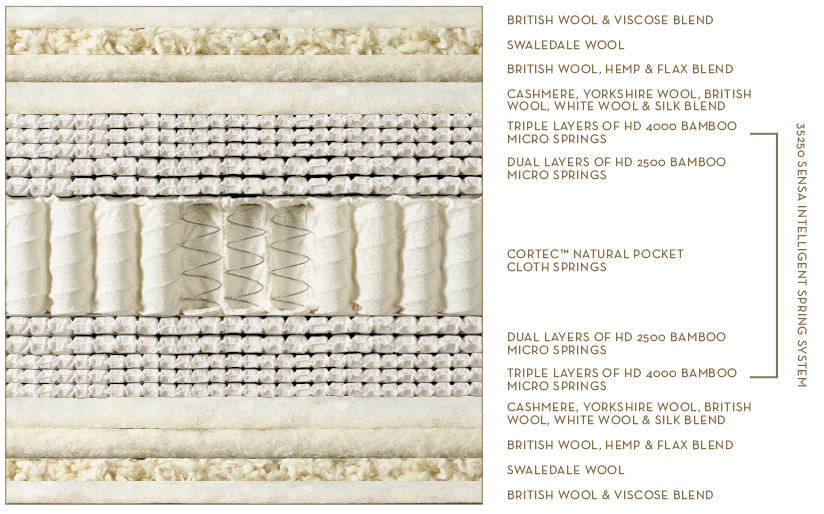 A superior sleeping environment, the Luxurious is made up of a 35250 Sensa Intelligent spring system and sumptuous, natural materials including silk, cashmere, Yorkshire wool, Swaledale wool, British wool, homegrown hemp and flax and viscose. Each filling is expertly blended and works in harmony with our Sensa Intelligent spring system, with a natural pocket cloth Cortec™ spring core, offering responsive support and a opulent night’s sleep. Finished with five rows of perfected hand side stitching and an in-house woven, premium super soft feel FR chemical treatment free fabric.