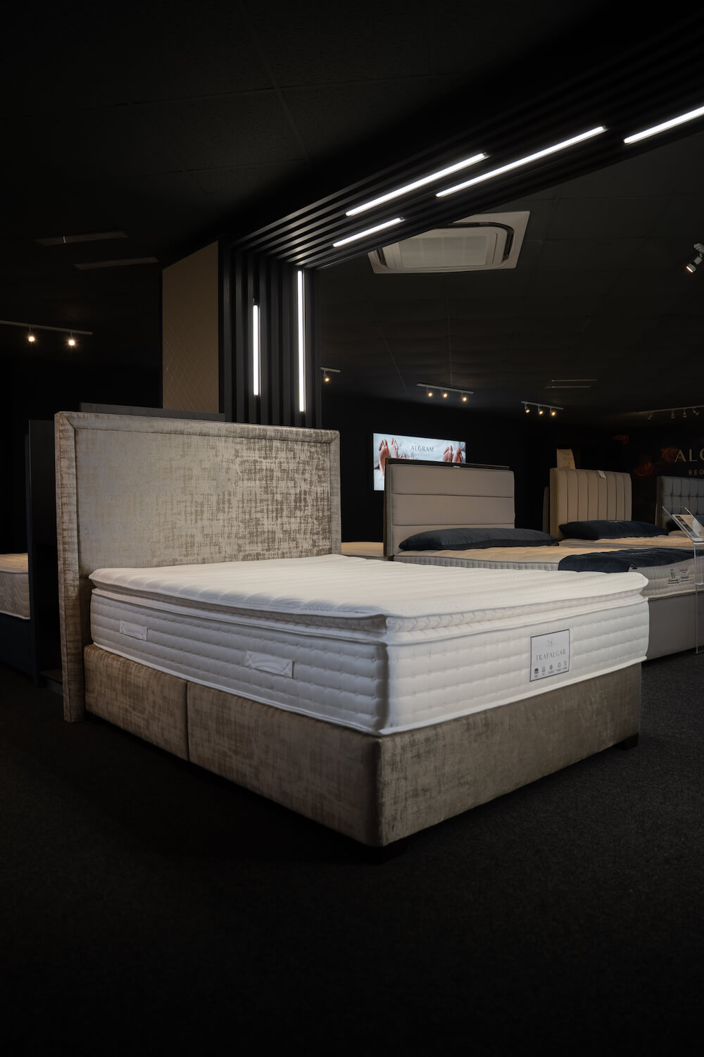The Trafalgar mattress showcases pocket springs beneath a lavish high-density memory foam pillow top, ensuring superior comfort and support. The Trafalgar is a turn free mattress ensuring hassle free enjoyment for years to come. Complemented by a deluxe base available in 15 exquisite colours, with the added convenience of storage options, the Trafalgar mattress epitomizes both luxury and functionality, catering to discerning tastes and practical needs alike.